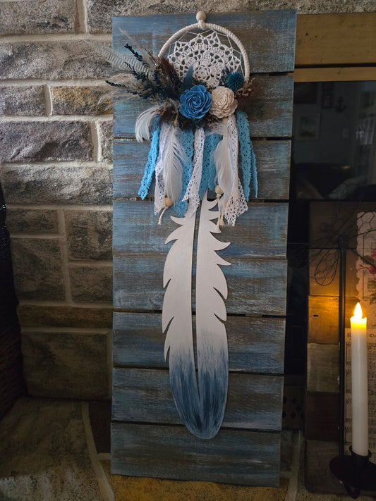 Pallet Wood Feather Wall Decor with dreamcatcher and wood flowers