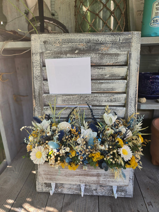 Wood Shutter mail sorter with wood flowers yellow and blues