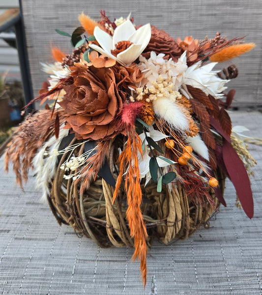 Wood Flower Grapevine Pumpkin in rust,burnt orange and terracotta home decor