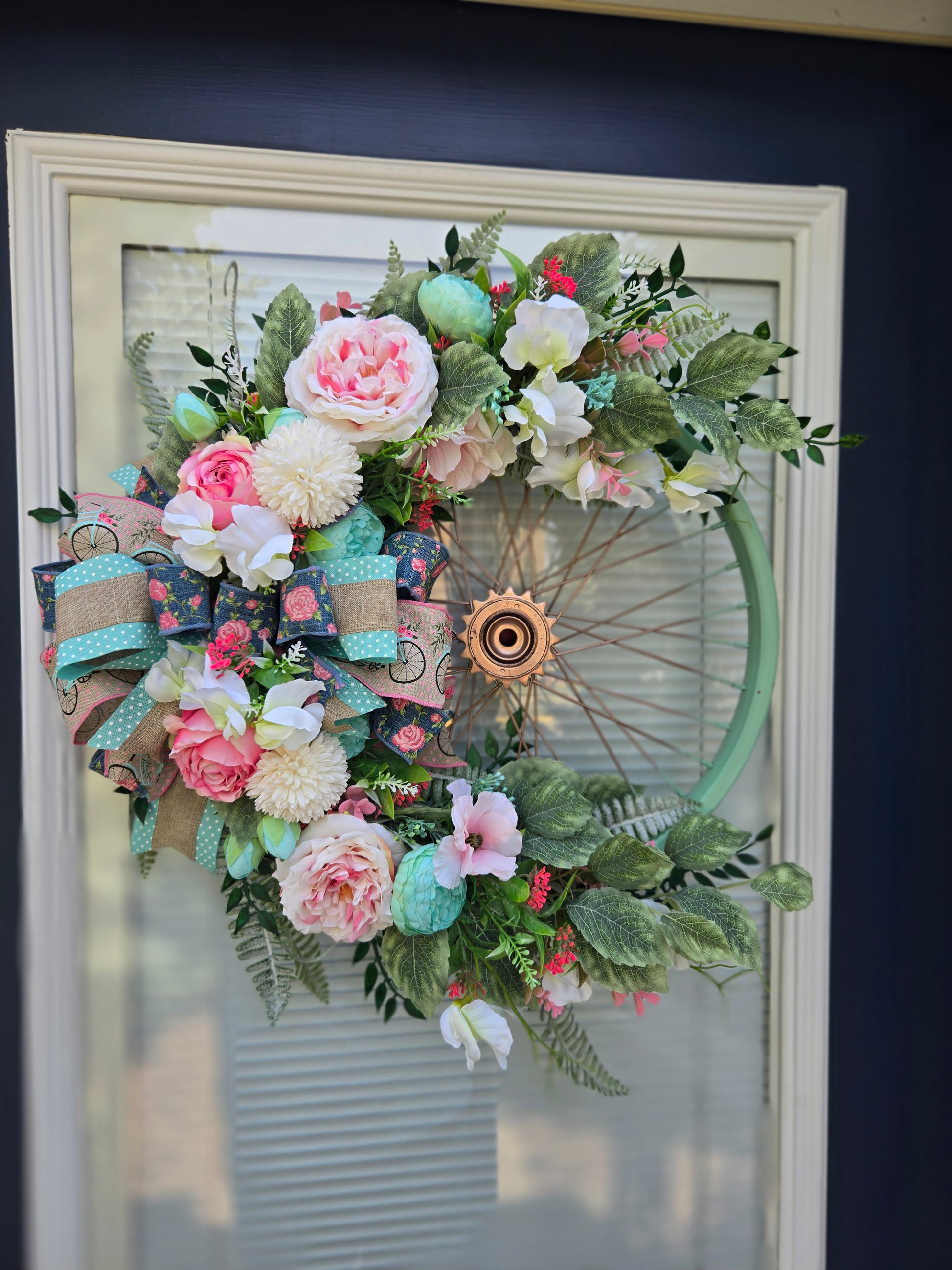 Bicycle wreath with artificial greenery and realistic pink silk flowers